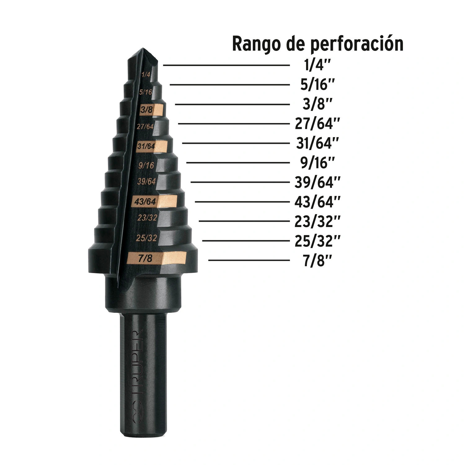 | Diámetros de perforación | 1/4", 5/16", 3/8", 27/64", 31/64", 9/16", 39/64", 43/64", 23/32", 25/32" y 7/8" |