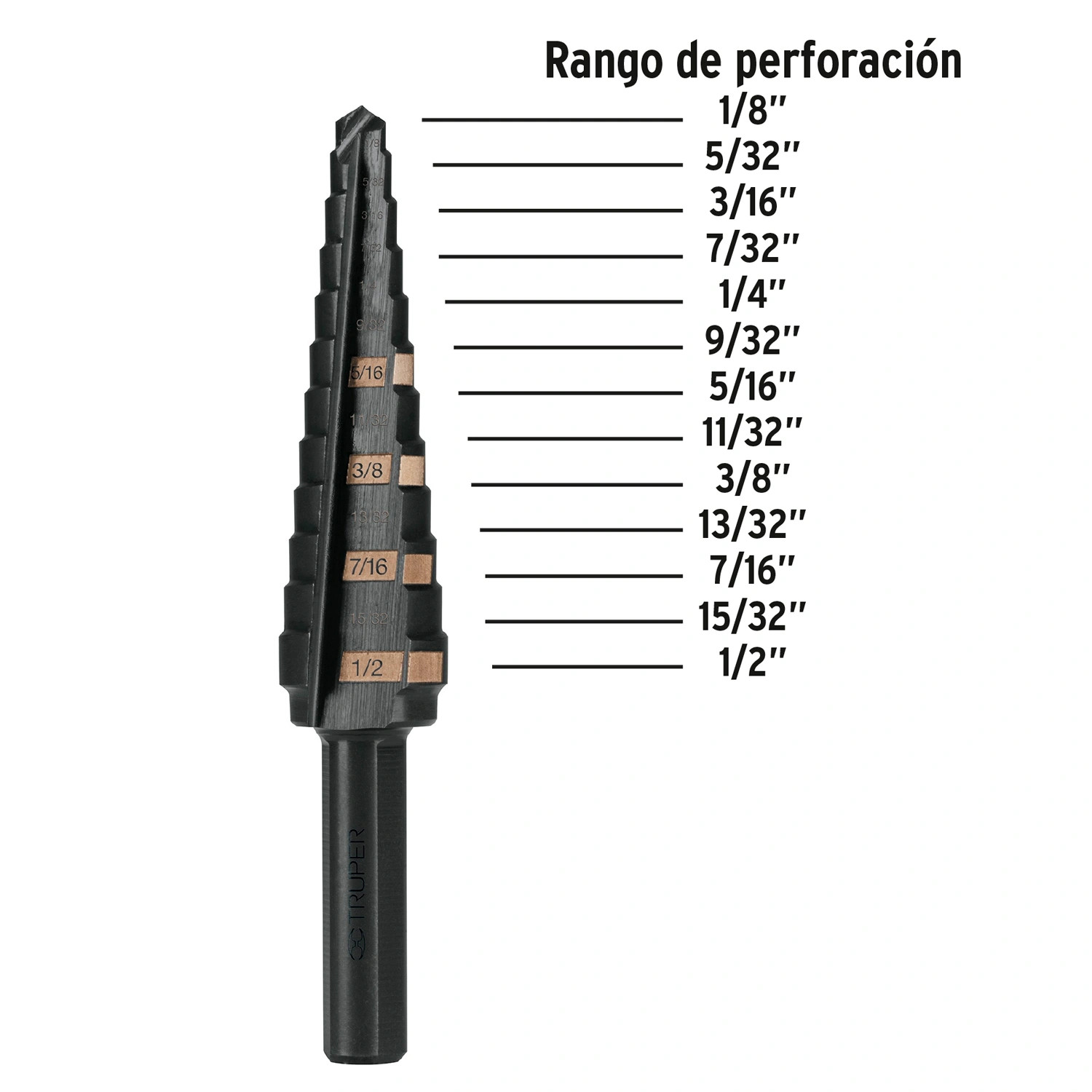 | Diámetros de perforación | 1/8", 5/32", 3/16", 7/32", 1/4", 9/32", 5/16", 11/32", 3/8", 13/32", 7/16", 15/32" y 1/2" |