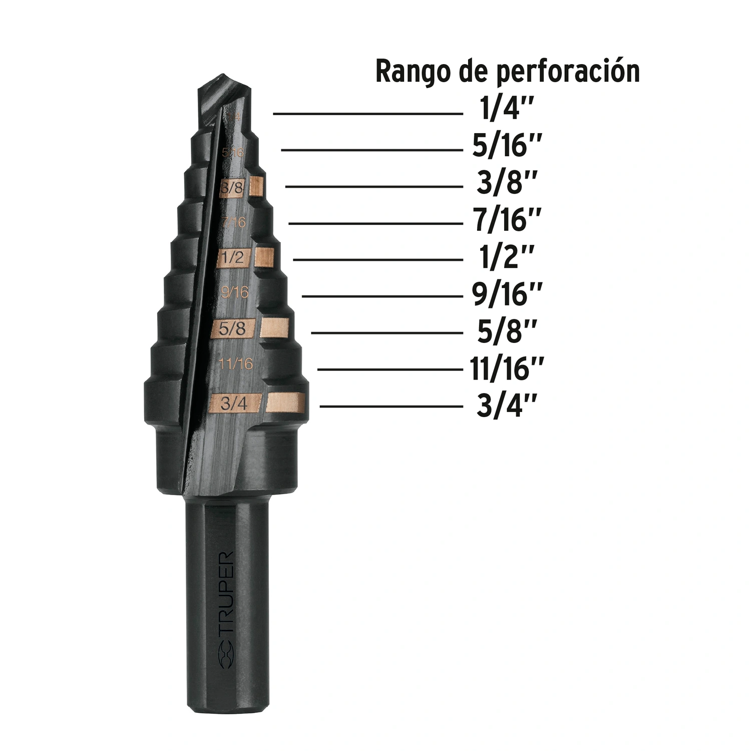 | Diámetros de perforación | 1/4", 5/16", 3/8", 7/16", 1/2", 9/16", 5/8", 11/16" y 3/4" |
