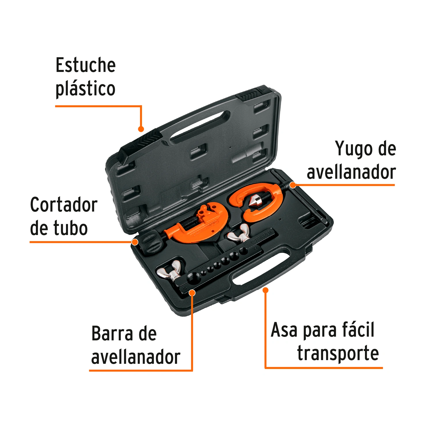 | Capacidad del avellanador | Tubos de 3/16", 1/4", 5/16", 3/8", 7/16", 1/2" y 5/8" |