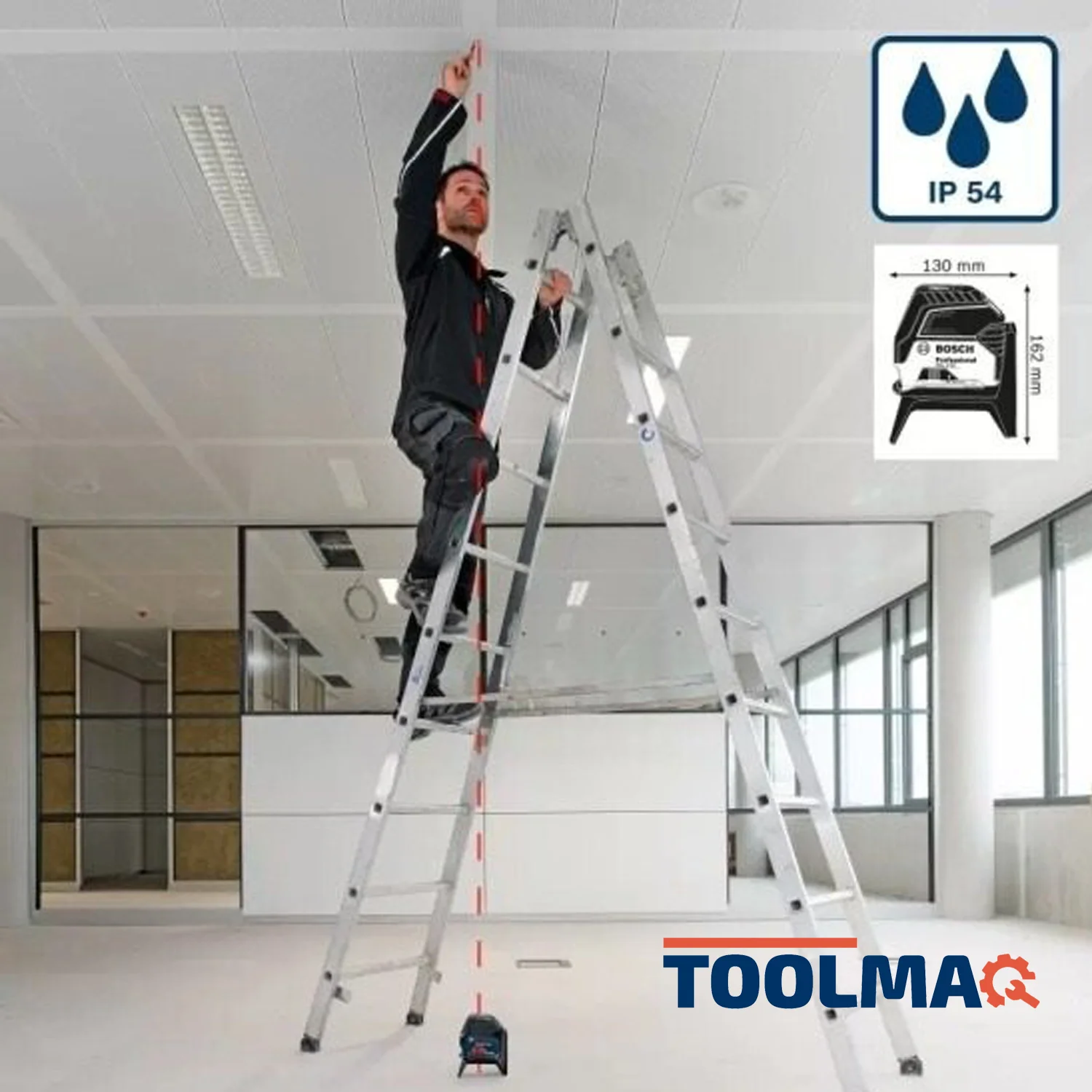 Líneas láser horizontales y verticales y dos puntos de plomada centrados con una visibilidad óptima.
