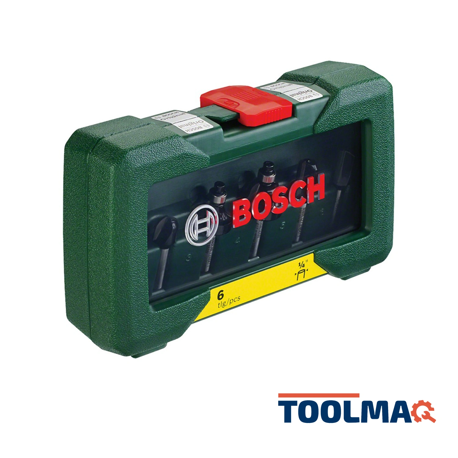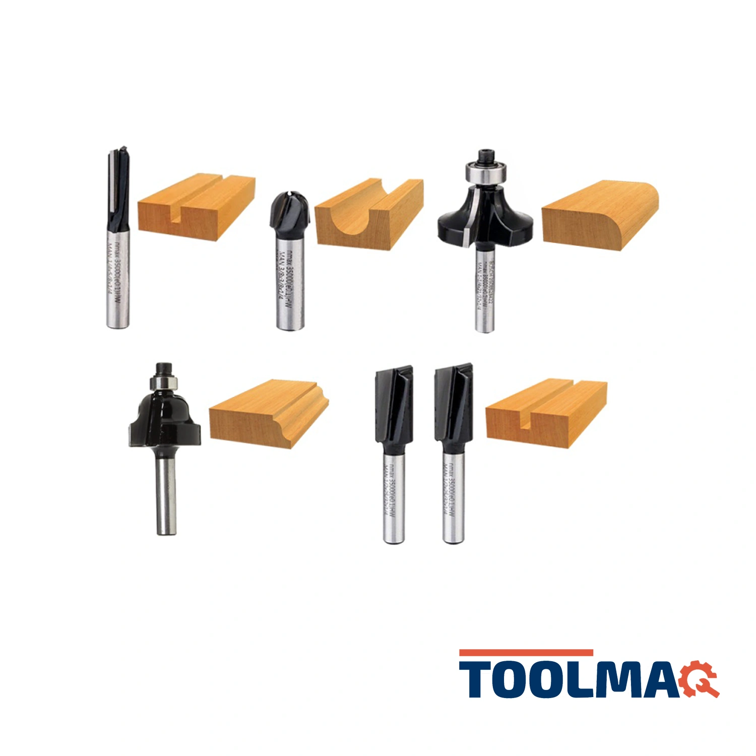 Set de fresas con encastre de 1/4" que incluye 3 fresas para ranurar, 1 fresa media caña, 1 fresa para redondear y 1 fresa para perfilar.